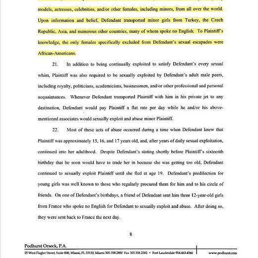 Eräässä oikeusasiakirjassa (liittyen Epsteinin vuoden 2008 syytesopimukseen) todetaan “tiedon ja uskomuksen perusteella”, että Epstein kuljetti alaikäisiä tyttöjä Turkista, Tšekistä, Aasiasta ja muista maista Yhdysvaltoihin.