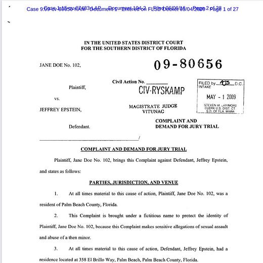 Oikeusjutut, kuten Jane Doe 102 vs. Jeffrey Epstein (tapausnumero 9:09-cv-80656 Floridan eteläisessä piirioikeudessa vuodelta 2009), kuvaavat hyväksikäyttöä alaikäisiä kohtaan. Näissä asiakirjoissa ei kuitenkaan suoraan mainita Turkkia tai kurdilapsia, vaan ne keskittyvät yleisesti alaikäisten värväämiseen Yhdysvalloissa.