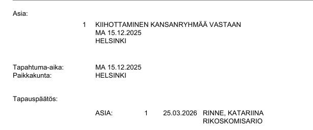 Lähes puoli vuotta Helsingin poliisilaitoksella pyörinyt “rikostutkinta” kuulemma “kansanryhmää vastaan kiihottamisestani” on nähtävästi päättynyt viime kuussa, kun tutkinnanjohtaja on vaihtunut.