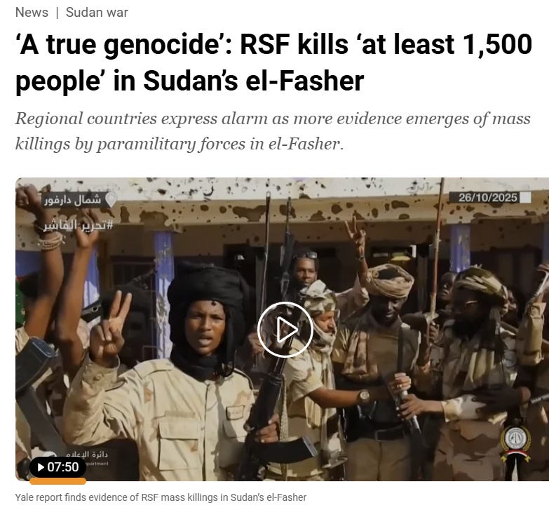 Samaan aikaan punavihreiden ihailemat islamistit suorittivat oikean kansanmurhan Sudanissa, murhaten viisi miljoonaa aseetonta siviiliä viimeisten kahden vuoden aikana – kaapaten kymmeniä tuhansia tyttöjä seksiorjiksi Koraanin käskyjen mukaisesti.