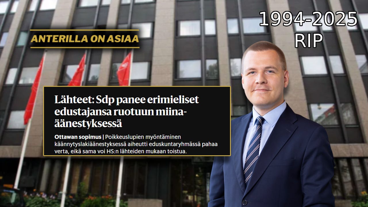 Edustaja Suomen sosiaalidemokraattien riveistä oli ensin sairauslomalla ja sitten päätti henkensä. Puolueensa kanssa erimielisyyksiä kokenut edustaja koki "ruotuun laittamista" ennen tekoaan.