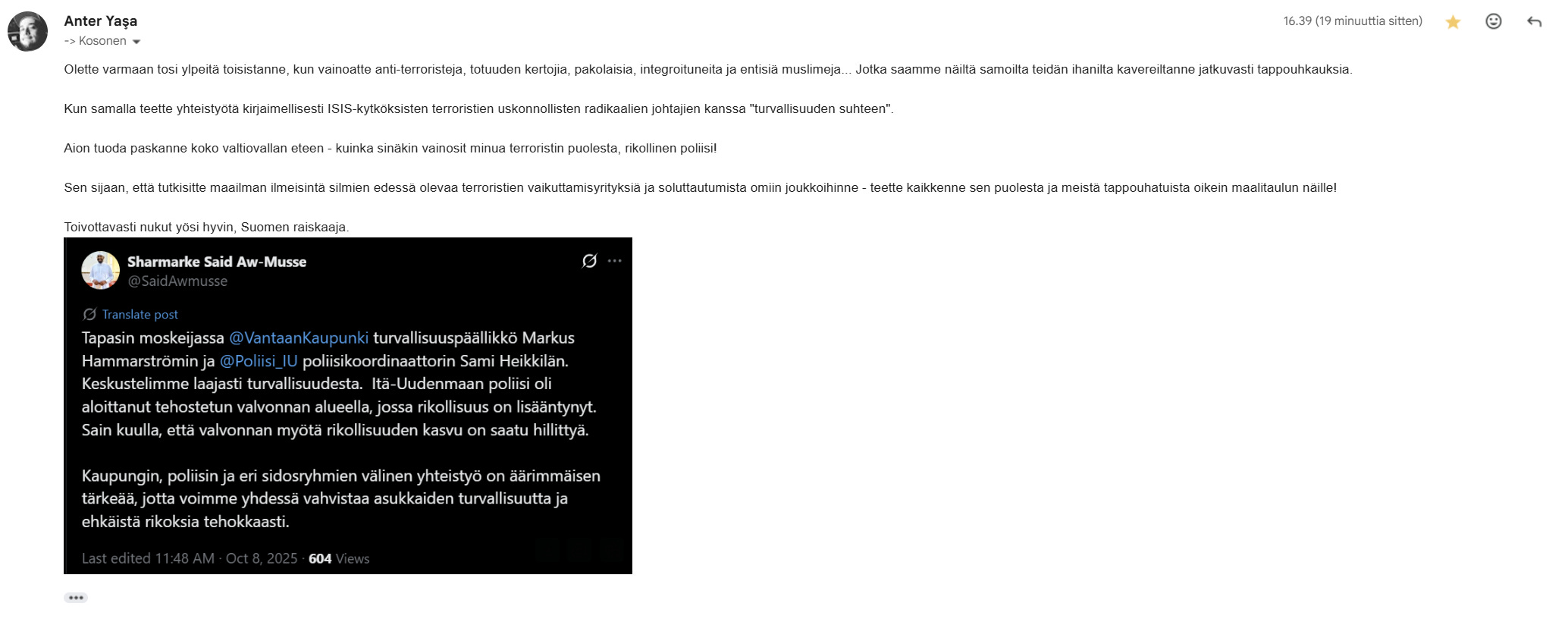 Laitoinkin näin minua vainonneelle, Helsingin sharia-poliisilaitoksen islamisteja ja terroristeja avustavalle poliisille Juha-Pekka Kososelle, jolla on useita rikostuomioita itsellään väärinkäytöstä, sähköpostia:
