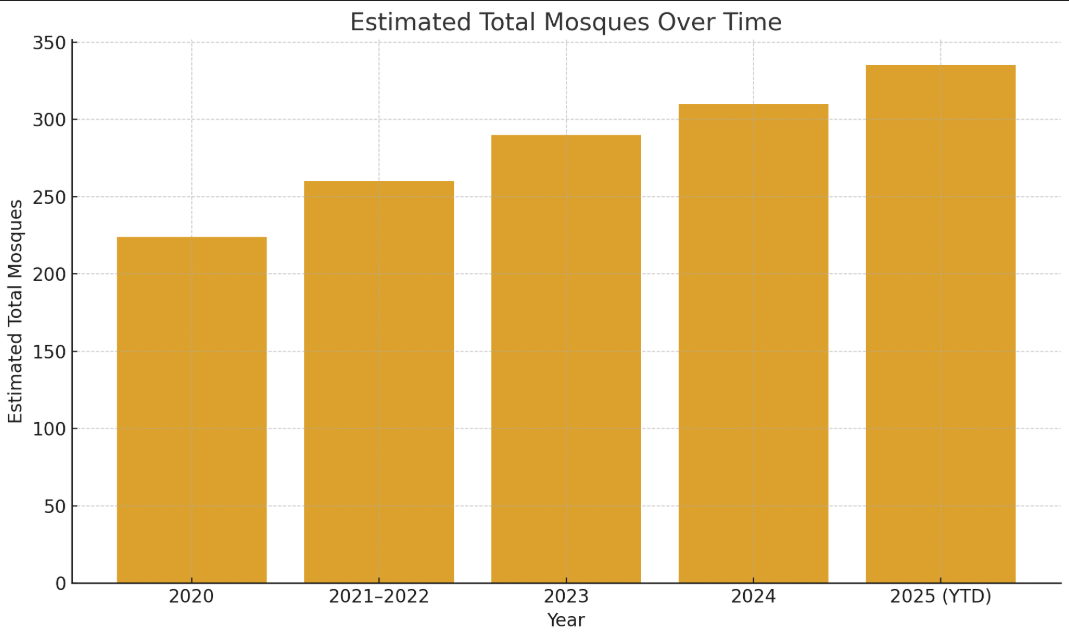 Kasvu ei ole tasainen. Sunni-moskeijat hallitsevat (90 %+), shia- ja ismaili-lahkot lisäävät “vivahteita”. Yhtään “räjähdysvuotta” ei erotu; sen sijaan kasvu on varmaa ja asteittaista: 20–30 vuosittain vuosina 2021–2023, piikki 30–40:een vuosina 2024–2025 asumisbuumin keskellä.