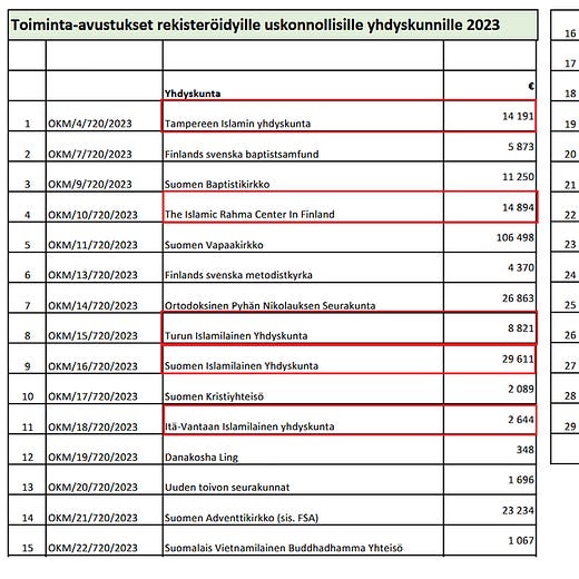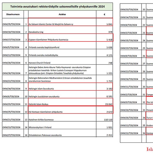 11 islamilaista yhdyskuntaa sai yhteensä 135 662 euroa.