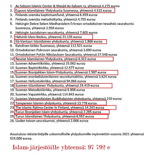 Kuitenkin islamilaisten järjestöjen osuus valtion yleisavustuksista on lähes 26 %.
